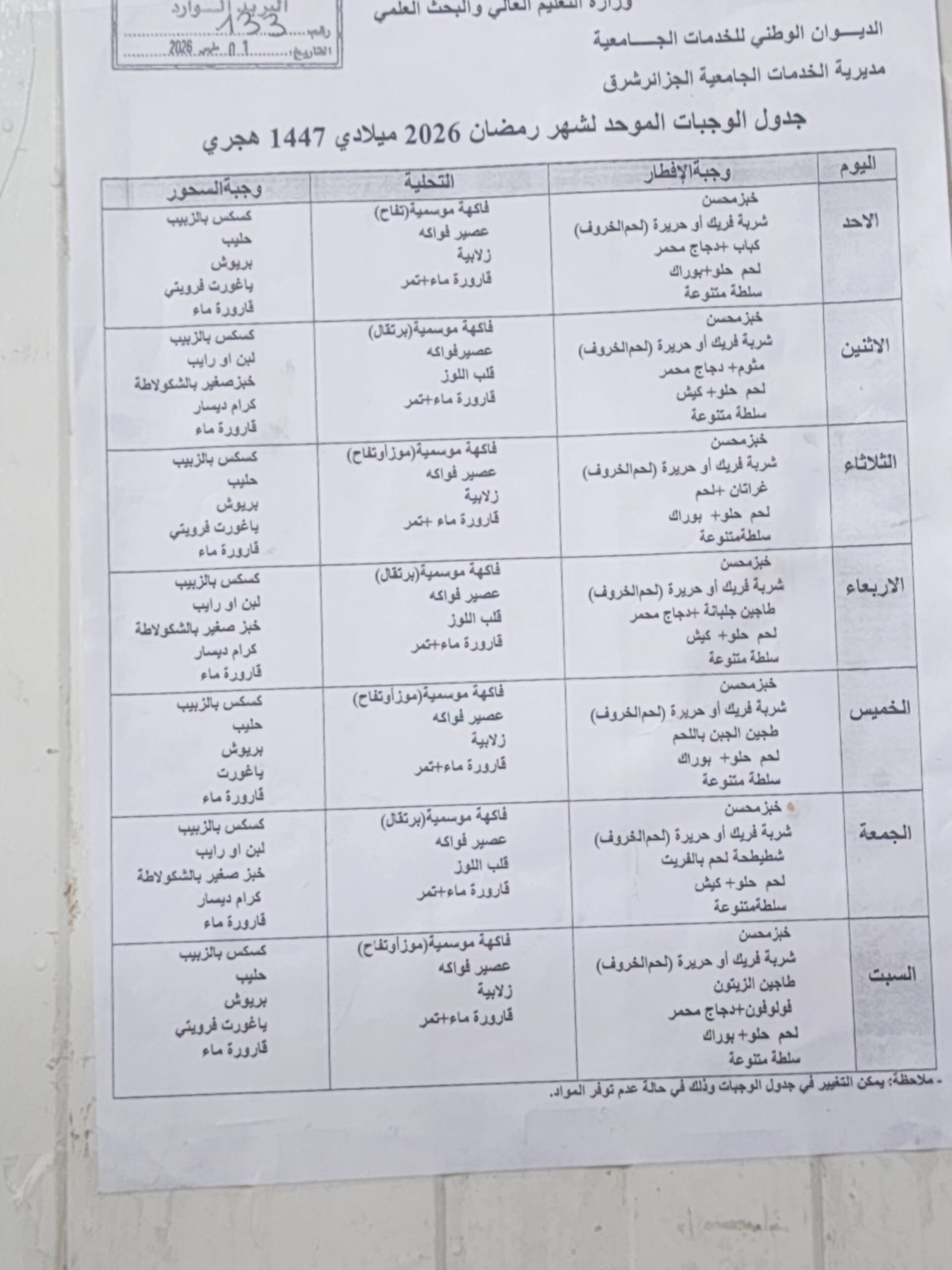 في إطار توجيهات وزارة التعليم العالي والبحث العلمي المتعلقة بمتابعة ومراقبة خدمات الإطعام على مستوى المطاعم الجامعية، قامت لجنة ممثلة عن المدرسة العليا لعلوم التغذية والصناعات الغذائية، يوم الأربعاء 04 مارس 2026، بزيارة ميدانية إلى الإقامة الجامعية للبنات باب الزوار الجرف