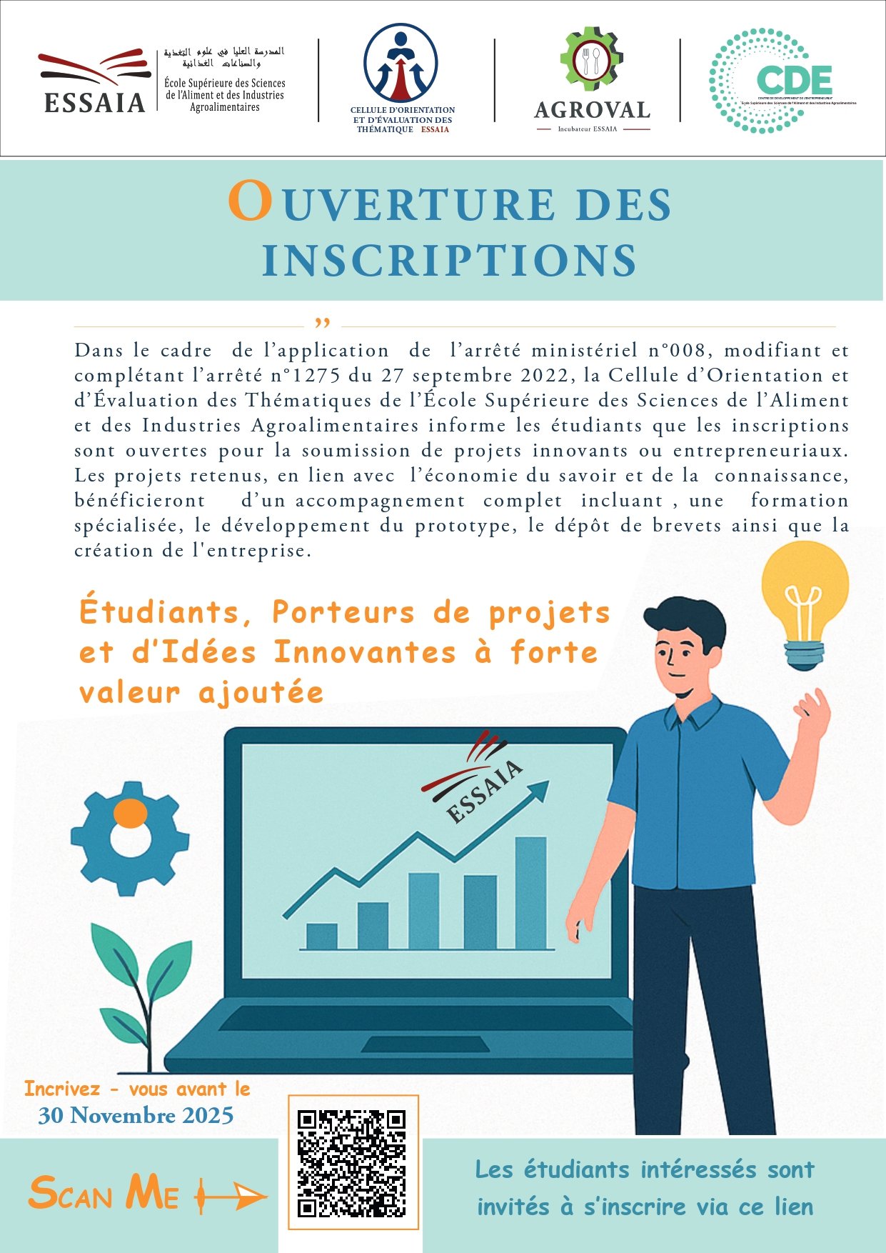 Journée de sensibilisation – Incubateur, CDE et Intelligence ArtificielleAujourd’hui, l’ESSAIA a organisé une journée de sensibilisation dans le cadre du programme de la cellule d’orientation et d’évaluation des thématiques, dédiée à la découverte de l’incubateur, du Centre de Développement de l’Entrepreneuriat (CDE) et des applications de l’intelligence artificielle dans le domaine de l’innovation et de...Read More